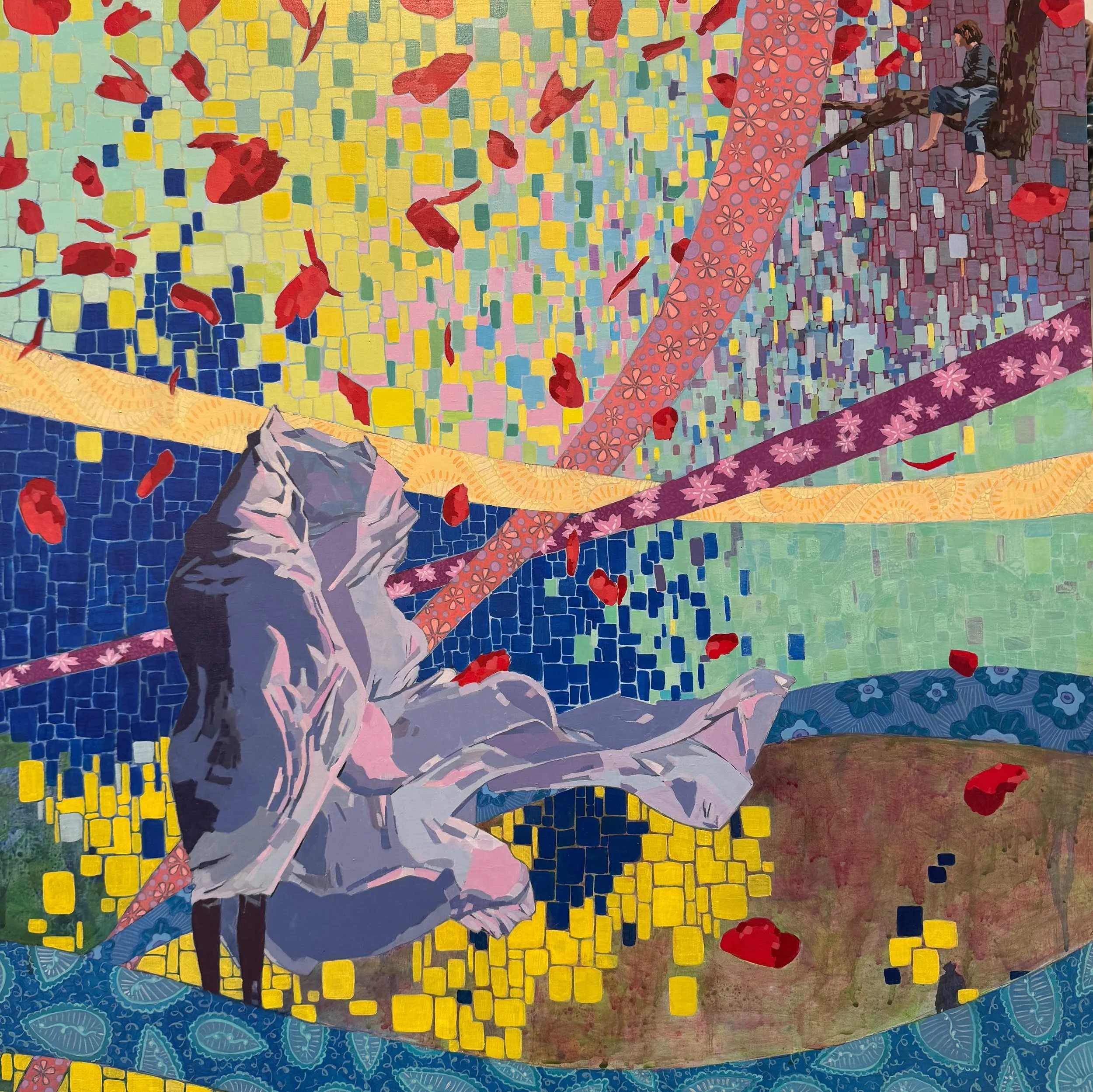 "There is a lot going on in Lotte Petricone's painting/collages. Evocative colors with seemingly multiple narratives draw the viewer in to ponder and decipher meaning, though an understanding of it's meaning is not necessary to appreciate these beautiful compositions."