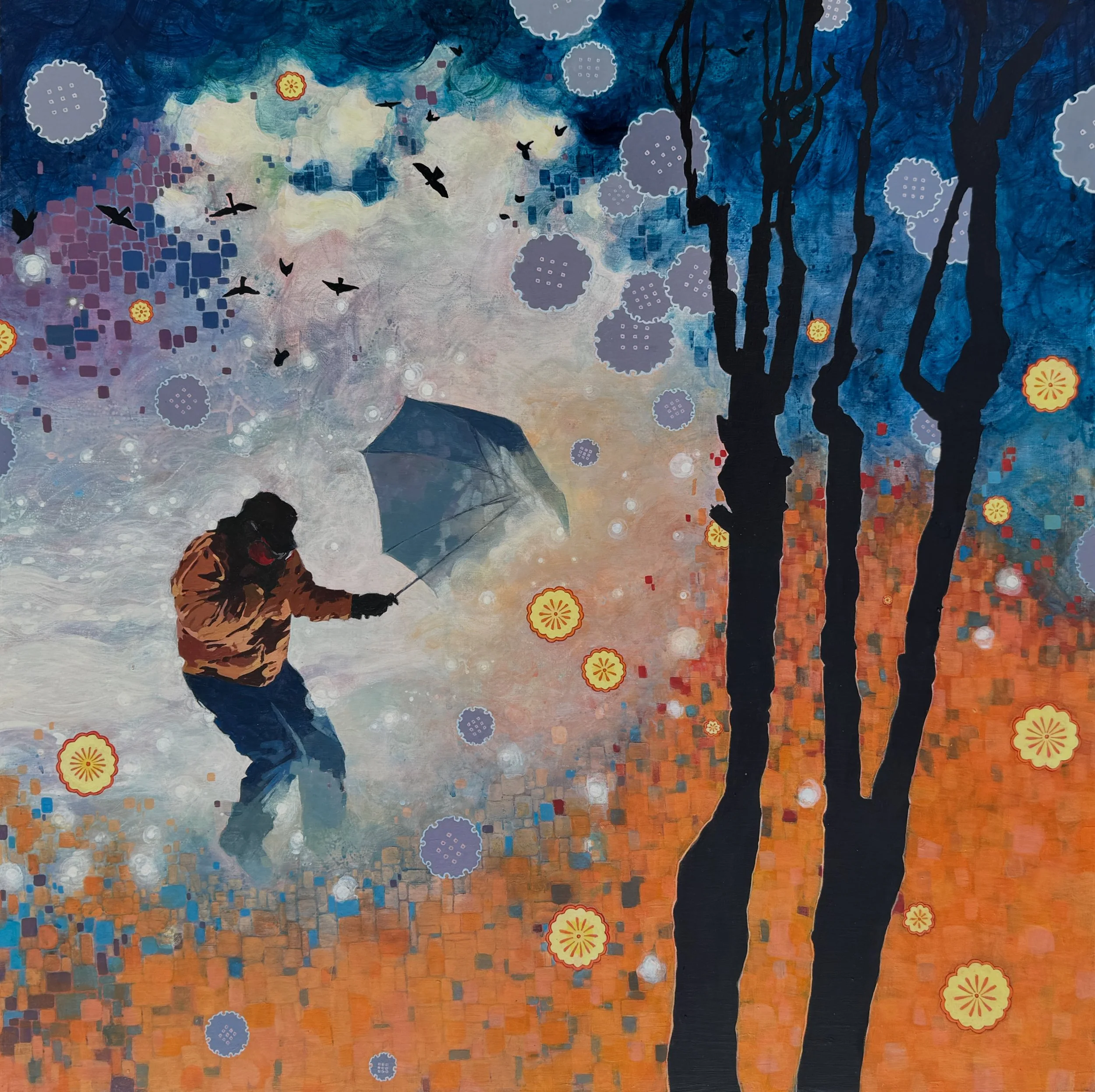 "There is a lot going on in Lotte Petricone's painting/collages. Evocative colors with seemingly multiple narratives draw the viewer in to ponder and decipher meaning, though an understanding of it's meaning is not necessary to appreciate these beautiful compositions."