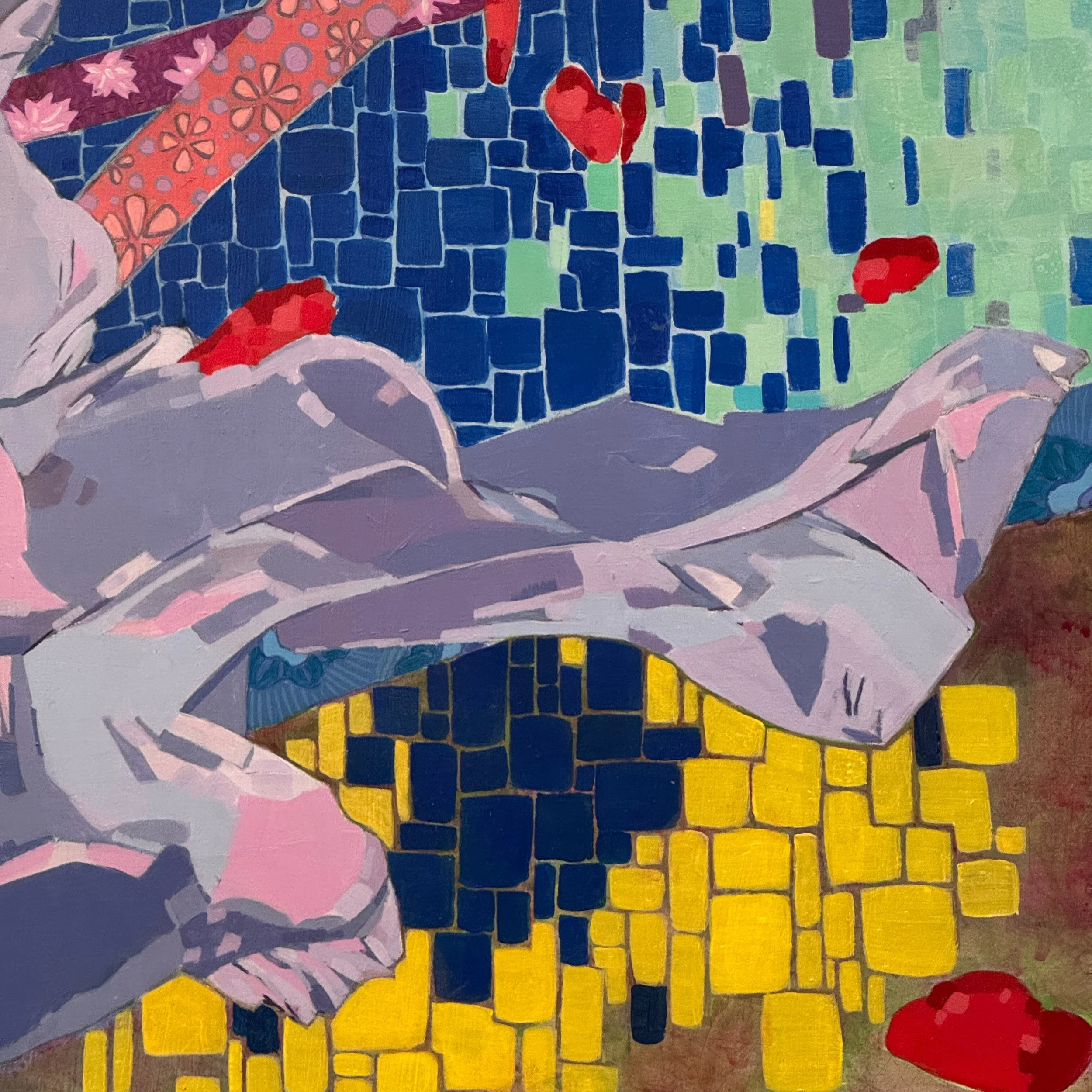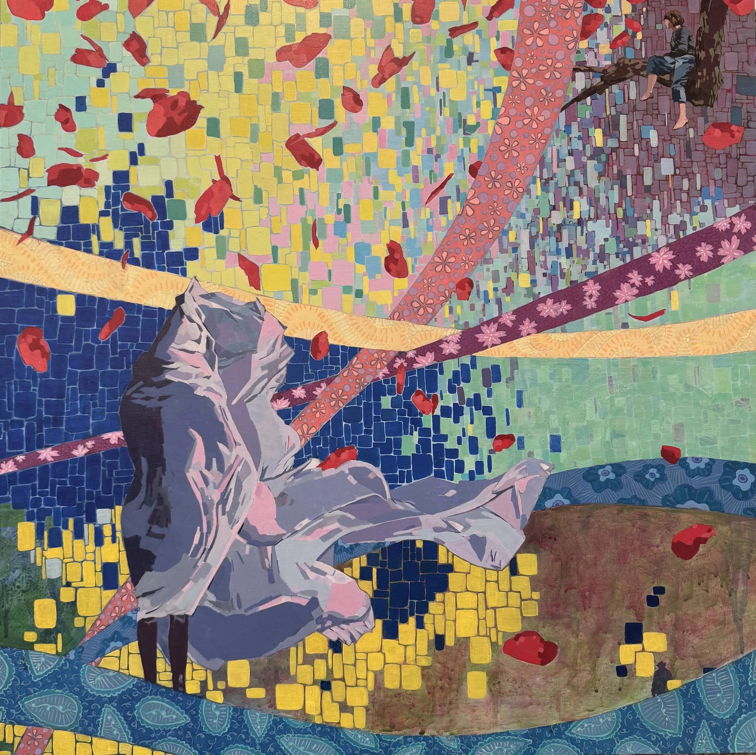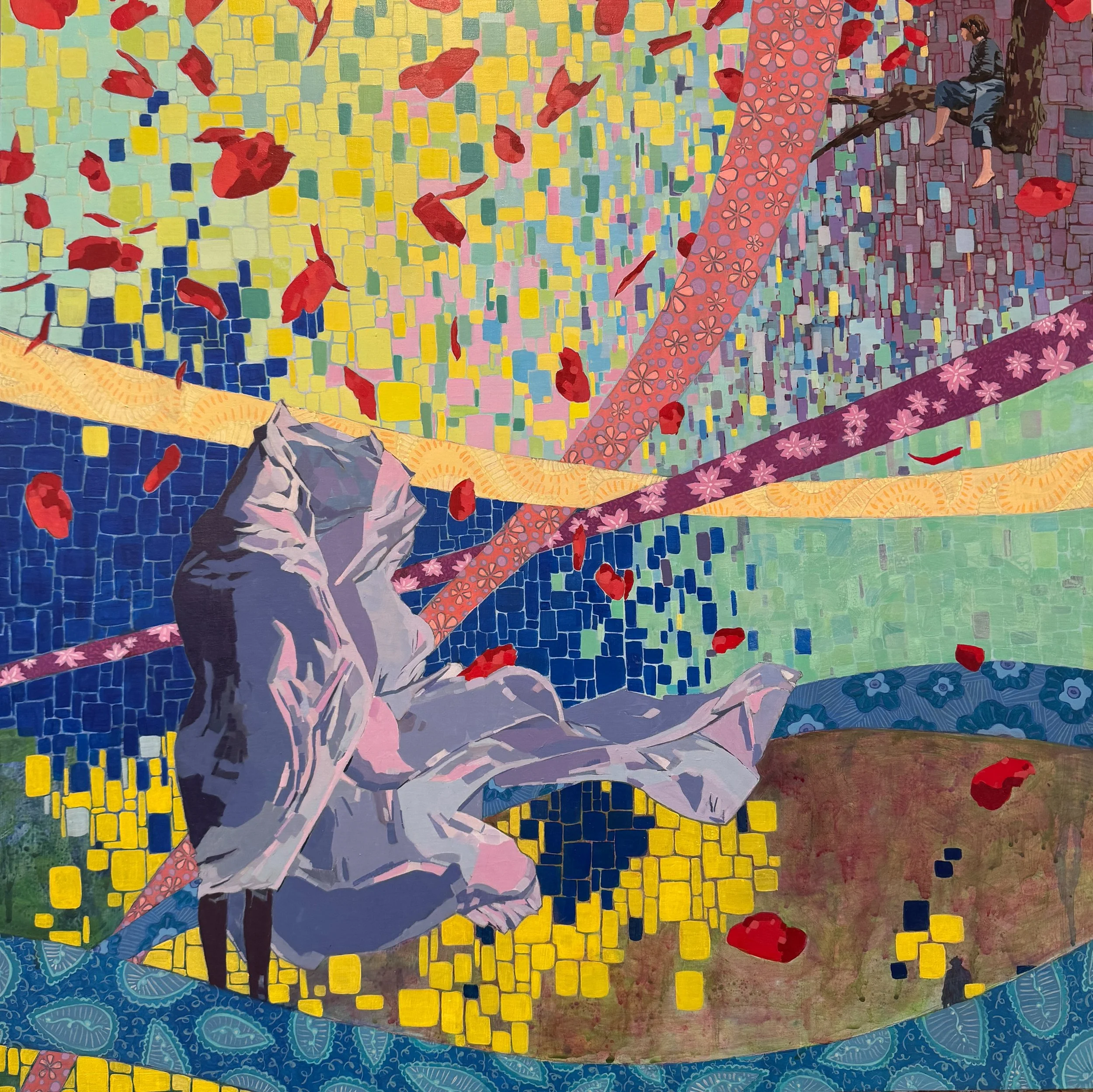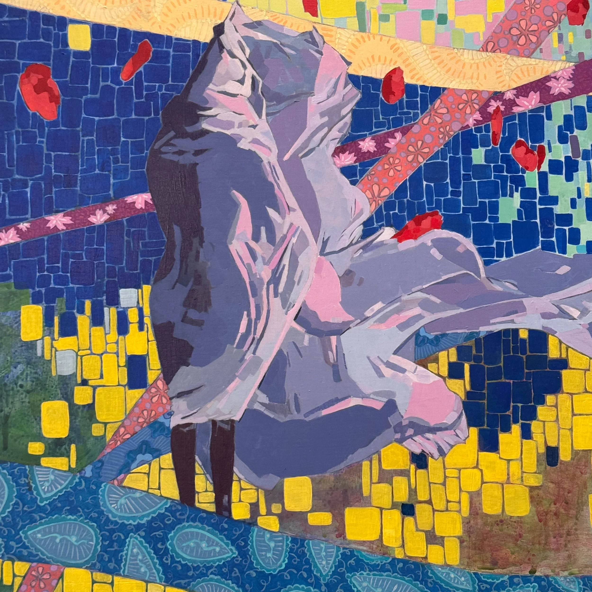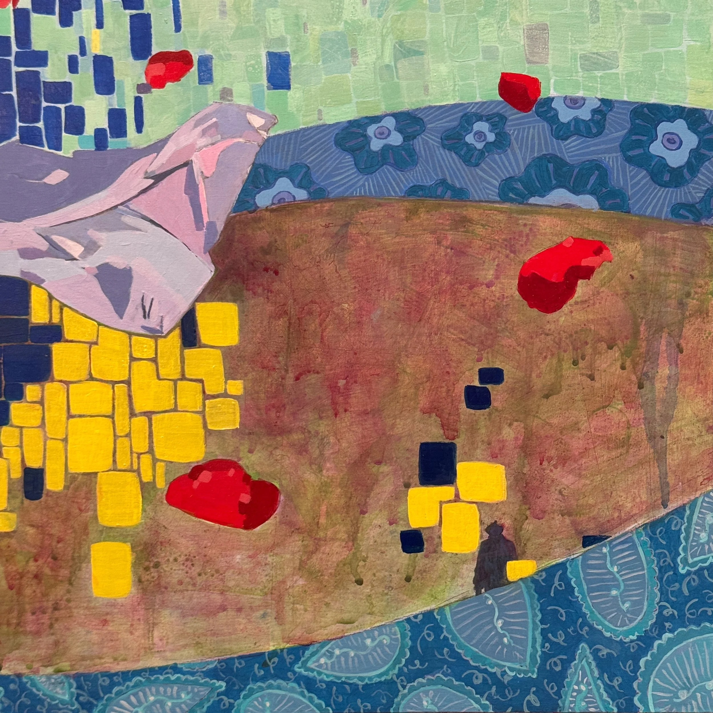 "There is a lot going on in Lotte Petricone's painting/collages. Evocative colors with seemingly multiple narratives draw the viewer in to ponder and decipher meaning, though an understanding of it's meaning is not necessary to appreciate these beautiful compositions."
